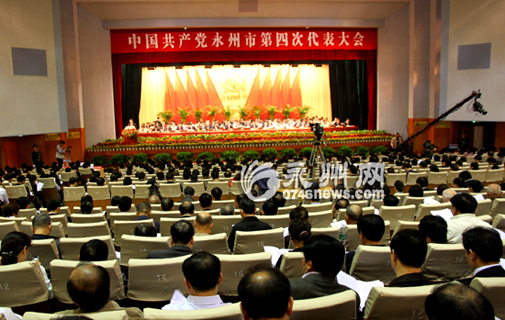 修葺一新的永州会堂,灯火辉煌,显得格外庄严、雄伟。主席台前鲜花盛开,上方悬挂着“中国共产党永州市第四次代表大会”巨幅会标,主席台中央由镰刀和锤子组成的党徽在10面鲜艳红旗簇拥下熠熠生辉。