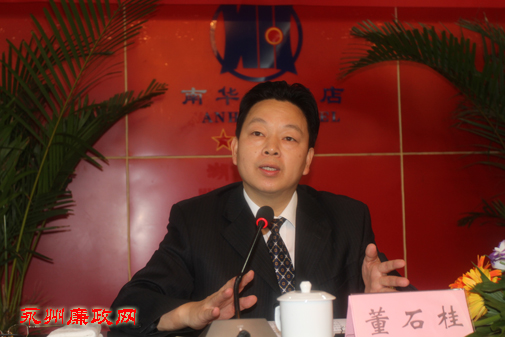 市委常委、市纪委书记董石桂在全会上讲话。董石桂说,新一届市纪委肩负着全面贯彻落实反腐倡廉战略方针,加快推进惩治和预防腐败体系建设的重大责任,肩负着为实现永州科学赶超、开放崛起保驾护航的重大使命,新当选的市纪委委员和常委会委员一定要认真贯彻落实市第四次党代会精神,忠实履行党章赋予的职责,为实现党代会提出的目标任务提供坚强的政治保证。董石桂要求,全市纪检干部要做勤奋学习的表率;要做服务大局的表率;要做维护民利的表率;要做改革创新的表率;要做团结干事的表率;要做廉洁自律的表率,以更加坚定的信心、更加坚决的态度、更加有力的举措,不断提高反腐倡廉建设科学化水平,为科学赶超,开放崛起,创造永州人民幸福生活作出新的更大贡献。
