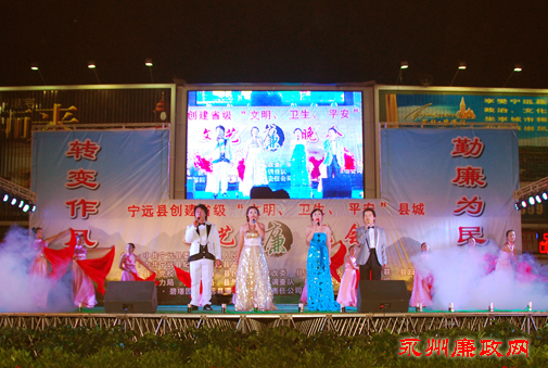 本网11月7日讯11月4日,由中共宁远县委、宁远县人民政府主办,宁远县纪委承办的“转变作风,勤廉为民”广场廉政文艺晚会在宁远县文庙广场举行,全县副科以上单位班子成员、全体县级领导、及社会各界群众近6000人现场观看了晚会,市纪委常委段春平、市纪委宣教室副主任宾柱元应邀出席晚会。晚会主题鲜明,内容丰富,节目精彩感人,新创廉政歌曲合唱、廉政小品、诗歌朗诵、歌舞互动,让整个晚会高潮迭起,社会反响强烈。这是宁远县大力加强廉政文化建设的一个缩影。