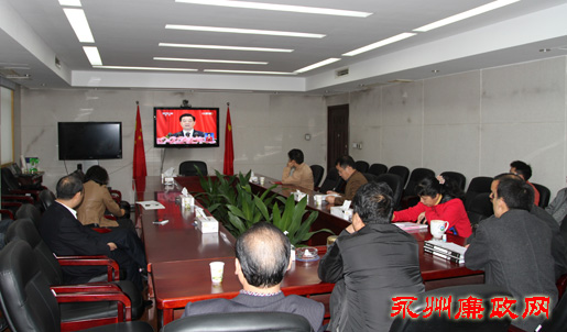 在市纪委会议室,市纪委监察局机关在家的党员干部集中观看党的十八大现场直播,认真聆听中共中央总书记胡锦涛同志的工作报告。胡锦涛总书记在报告中强调,坚定不移反对腐败,永葆共产党人清正廉洁的政治本色。反对腐败、建设廉洁政治,是党一贯坚持的鲜明政治立场,是人民关注的重大政治问题。这个问题解决不好,就会对党造成致命伤害,甚至亡党亡国。反腐倡廉必须常抓不懈,拒腐防变必须警钟长鸣。要坚持中国特色反腐倡廉道路,坚持标本兼治、综合治理、惩防并举、注重预防方针,全面推进惩治和预防腐败体系建设,做到干部清正、政府清廉、政治清明。加强反腐倡廉教育和廉政文化建设,深化重点领域和关键环节改革,健全反腐败法律制度,更加科学有效地防治腐败。严格执行党风廉政建设责任制。坚决查处大案要案,着力解决发生在群众身边的腐败问题。不管涉及什么人,不论权力大小、职位高低,只要触犯党纪国法,都要严惩不贷。