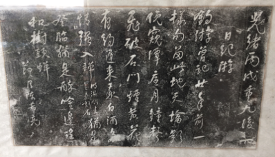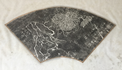 新田县青云公园内有一处叫“仙人下桥”的景点,该地右临深壑绝壁,左边遍布巉岩,岩石有的“皱、透、漏、瘦、丑”,灵秀生趣;有的笨拙古朴,奇丑无比。在左边的石壁上有一处摩崖石刻,居上一幅扇面为米芾的《醉菊图》,画面四朵怒放的菊花相拥成团、笔法简练、自然流畅。下面一幅长方形石面上有诗一首: