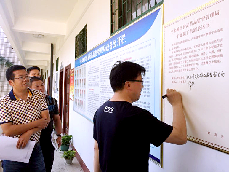 “工作日早餐中餐都不能喝酒”、“平时喝了酒后不能出去执法”、“也不能穿执法服装在公共场合饮酒”、“ 端午节喝酒也不能任性,酗酒、赌酒、斗酒、强行劝酒都是禁止的行为”,5月26日,冷水滩区食药监局100余名党员干部在“禁酒承诺书”上郑重签下自己的名字,晒在机关走廊醒目处,时刻接受监督。
