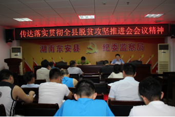 (图为5月29日晚东安县纪委传达贯彻全县脱贫攻坚推进会议精神现场)