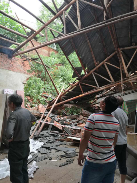 (暴雨致使墙体、厂房倒塌,区委副书记、监察局长胡纯辉与仁湾街道干部职工一起查看灾情)