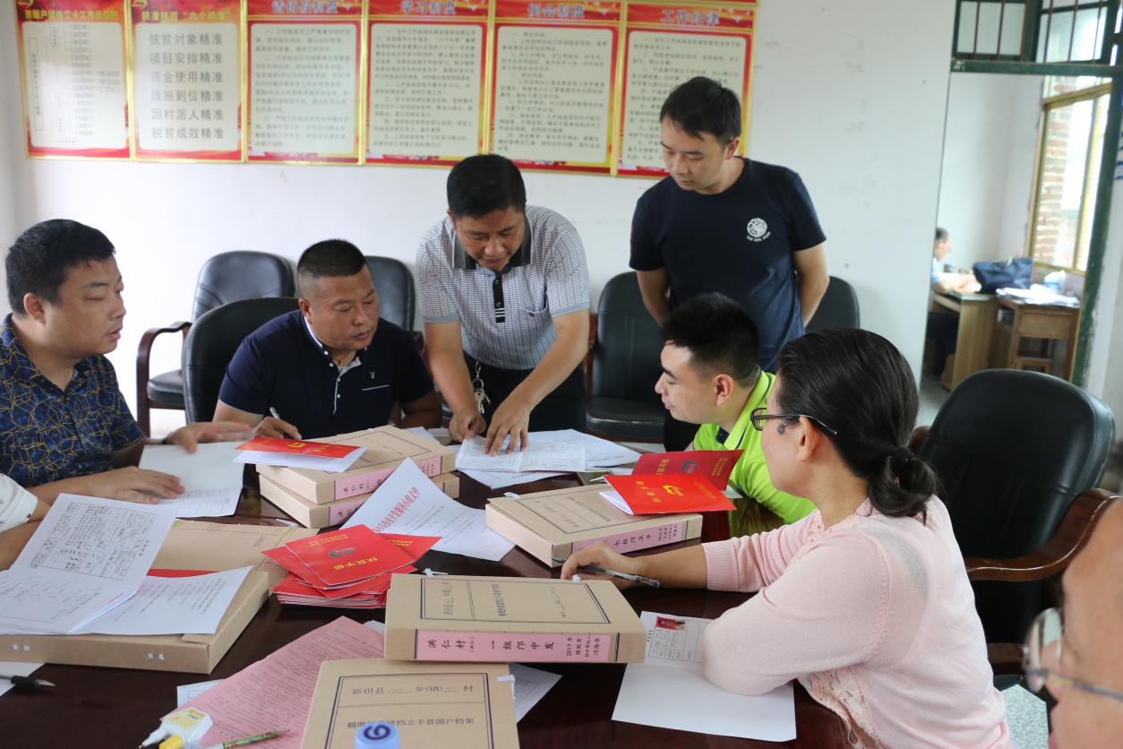 (图为村部会议室里,驻洪仁村工作队长陈柏顺指导大家规范填写扶贫手册)