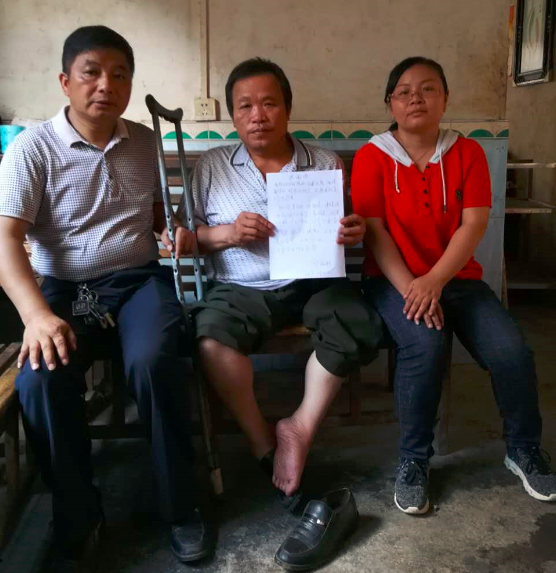 “县纪委的陈柏顺、谢俊波同志扶贫工作认真负责,对我嘘寒问暖、关心备至,我作为一个残疾人,没有其他表达方式,只能写封感谢信为他们点赞!”写信的邝柏林是谢俊波的帮扶对象户,因患小儿麻痹症导致二级残疾行动十分不便,八十六岁的母亲邝纯翠瘫痪在床将近两年,一直未办理残疾证。同样因行动不便而难以到县政务中心办理残疾证的还有纪检干部黄红芳的结对户周井翠和廖瑾柏的结对户邝中元。“急群众之所急,想群众之所想”对于纪检干部从来不是一句口号,而是切切实实的行动和实践。了解情况后,三名纪检干部和驻村工作队长陈柏顺马上联系县残联、县司法鉴定中心,协商时间来到陶岭镇洪仁村为三名残疾贫困户免费办理了残疾证,让他们能够享受到残疾人优惠政策。一封感谢信,不过百字,写出来的是帮扶对象户对帮扶责任人的谢意,说不尽的还有对纪检干部的深深信任。