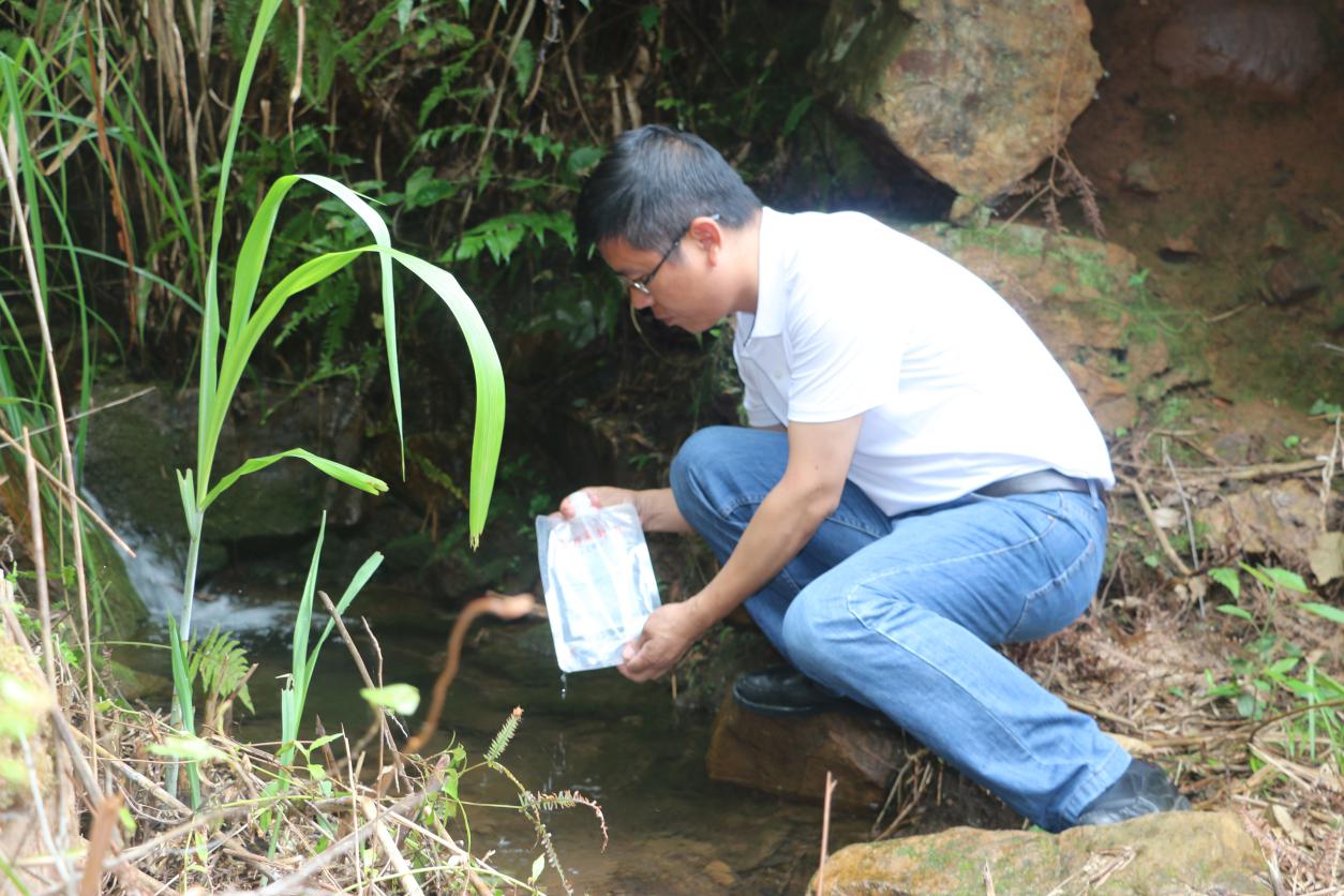(图为纪委书记汤小兵在牛塘村后的富竹窝山水源点现场取水样)