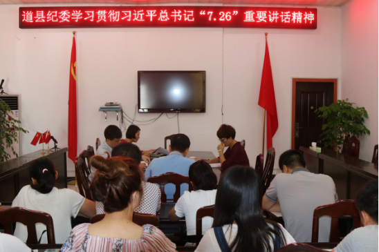 8月8日下午,道县纪委监察局在县纪委会议室传达学习习近平总书记“7•26”重要讲话精神,并进行了认真、热烈、深入的讨论。县纪委监察局机关全体干部、职工参加会议。