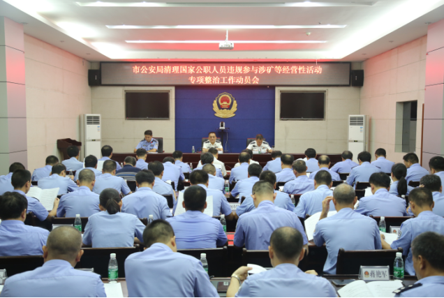8月23日,市公安局召开清理国家公职人员违规参与涉矿等经营性活动专项整治工作动员会,市公安局在家党委班子成员、协管工作的正副调研员、局属各单位全体班子成员、市公安干校主要负责人参加会议。会议由市公安局党委委员、副局长秦建彪同志主持,市公安局党委委员郑勇同志作动员讲话。