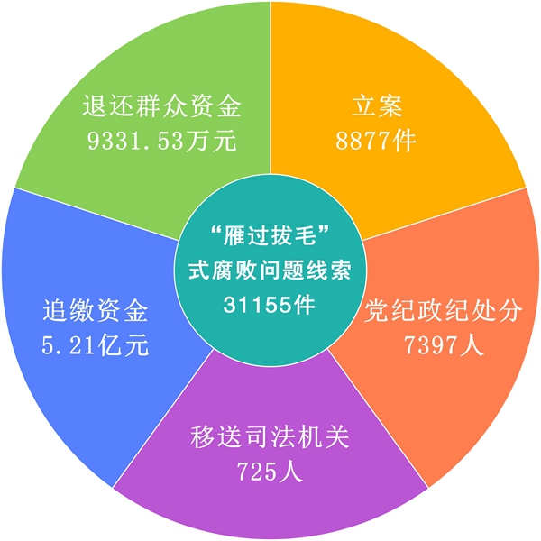 相对于“远在天边”的“老虎”,群众对“近在眼前”的“蝇贪”感受更为真切,“微腐败”更令群众深恶痛绝!强力“打虎”同时,各地也持续“拍蝇”。2016年开展“雁过拔毛”式腐败问题专项整治以来,全省纪检监察机关共发现“雁过拔毛”式腐败问题线索31155件,受理举报15231件,立案8877件,党纪政纪处分7397人,移送司法机关725人,追缴资金5.21亿元,退还群众资金9331.53万元。