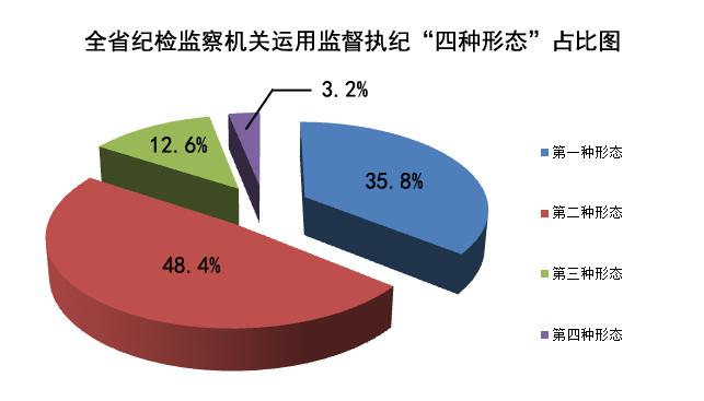 2016年以来,全省纪检监察机关运用监督执纪“四种形态”处理41392人次。其中,运用第一种形态14810人次,占“四种形态”处理总人次的35.8%;第二种形态20040人次,占48.4%;第三种形态5228人次,占12.6%;第四种形态1314人次,占3.2%。以第一、二种形态处理3.48万多人次,占到处理总人次的84.2%。