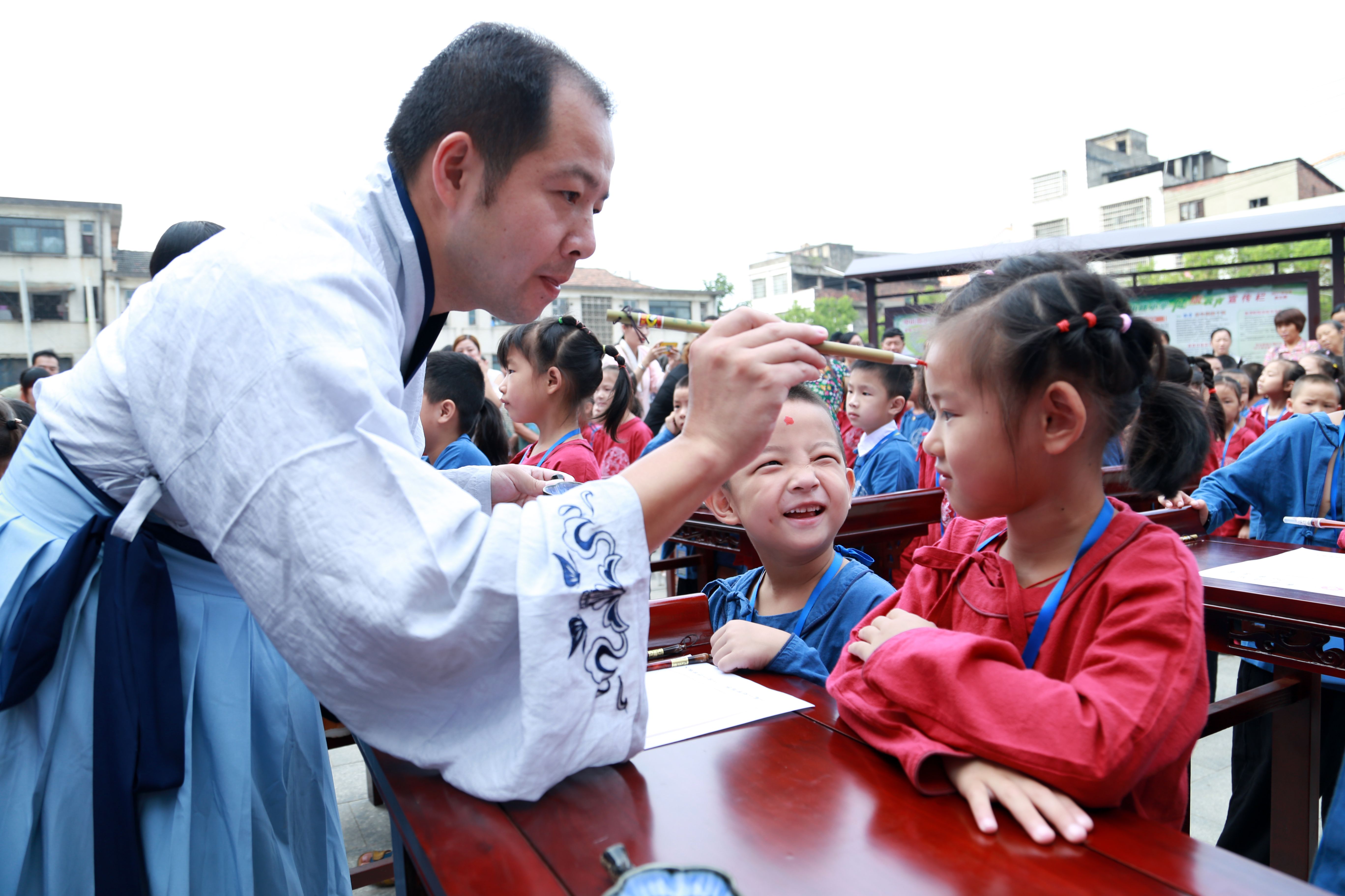 在主持人的带领下,新生们进行了“拜孔子”、“正衣冠”、“朱砂启智”、“击鼓鸣志”、“启蒙描红”、“茶敬亲师”等仪式。仪式上,师生们带着虔诚的心向孔子致以最高的敬意。老师、家长齐上阵,在孩子们的额头正中点上红痣,一边点一边给孩子献上盈盈祝福,以此寄托对孩子的美好祝愿。希望孩子们从今启蒙,知书学礼,认真学习,勤奋学习,学而不厌,学无止境。在活动现场,书法老师带领学生们学写的第一个汉字是“人”,老师希望学生们堂堂正正做人,相互支持,相互帮助,建设美好社会。