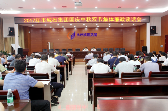 做廉洁人,过廉洁节。9月28日上午,市城投集团在五楼大会议室召开了中秋国庆双节集体廉政谈话会。董事、总经理蒋志刚主持会议并传达了市纪委《关于开展国庆中秋节日期间作风建设专项监督检查的通知》精神。集团公司班子成员、中层副职以上党员干部及关键岗位人员共90余人参加谈话。