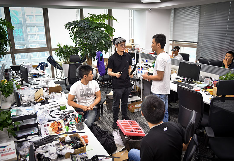 在深圳科技园的大疆创新总部,民用无人机领军者汪滔(中)参与研发人员的讨论(2015年5月22日摄)。新华社记者毛思倩摄