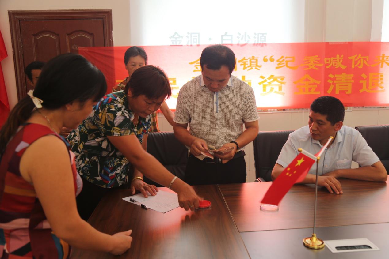 “邓国元800元,邓三谷140元……”7月4日上午,金洞管理区金洞镇纪委在白沙源村召开“纪委喊你来领钱”惠民资金现场清退会,将原村支部书记奉某截留村民2010年至2017年长达8年的退耕还林补助款6990元现场发放至每户林农手中,领款人喜笑颜开,在场群众无不拍手叫好。