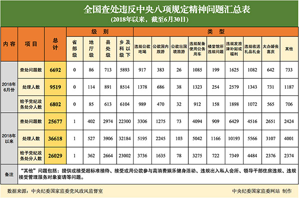为掌握全国贯彻落实中央八项规定精神情况,中央纪委在各省区市和新疆生产建设兵团、各中央和国家机关、各中央企业和中央金融企业等建立了落实中央八项规定精神情况月报制度。2018年以来,截至6月30日,全国查处违反中央八项规定精神问题情况如下: