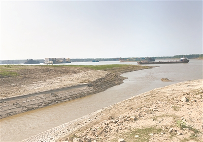 这里是赤磊洪道南侧与茶盘洲镇防洪大堤东侧交汇处。临近枯水期,土黄色的洲块露出湖面,如岛屿一般,在视野范围内绵延而去。