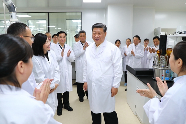 22日下午,习近平考察了珠海横琴新区粤澳合作中医药科技产业园。该产业园是《粤澳合作框架协议》下首个落地项目。习近平结合视频、沙盘、中医药产品展示,了解横琴新区规划建设以及产业园建设运营、中医药产业发展和国际交流合作情况。习近平走进车间,察看中药制品生产流程。在研发检测大楼,科研人员纷纷向总书记问好。习近平指出,中医药学是中华文明的瑰宝。要深入发掘中医药宝库中的精华,推进产学研一体化,推进中医药产业化、现代化,让中医药走向世界。他强调,建设横琴新区的初心就是为澳门产业多元发展创造条件。横琴有粤澳合作的先天优势,要加强政策扶持,丰富合作内涵,拓展合作空间,发展新兴产业,促进澳门经济发展更具活力。