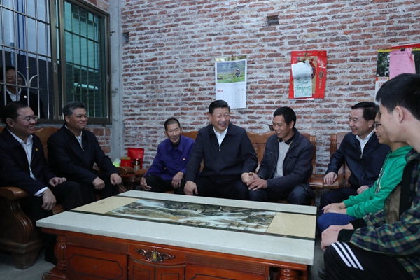 10月22日至25日,中共中央总书记、国家主席、中央军委主席习近平在广东考察。这是10月23日下午,习近平在英德市连江口镇连樟村贫困户陆奕和家,同他们亲切地拉家常。新华社记者 鞠鹏 摄