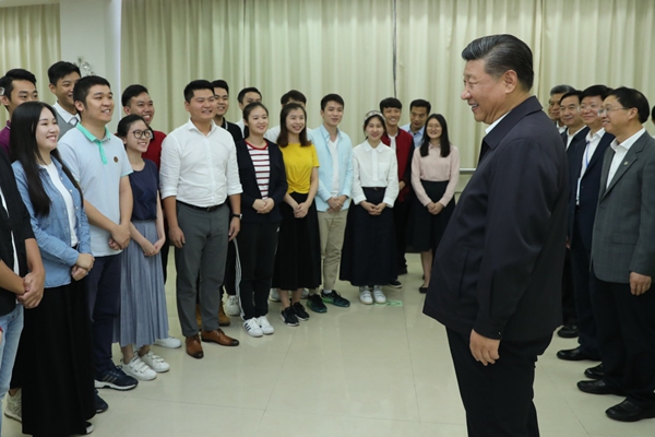 10月22日至25日,中共中央总书记、国家主席、中央军委主席习近平在广东考察。这是10月24日下午,习近平在广州考察暨南大学时同部分港澳台同胞和海外侨胞学生交流。新华社记者 鞠鹏 摄