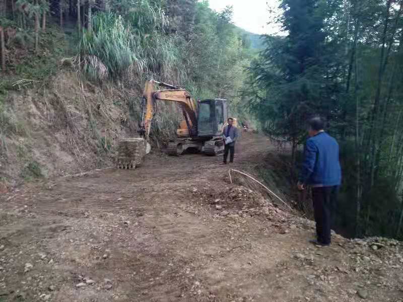 11月1日,双牌县何家洞镇何家洞村通村公路工程现场,两名村民拿着图纸、卷尺守在一旁勘测、监督。