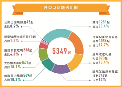 中央纪委国家监委网站66次“每周通报”共公开曝光违反中央八项规定精神典型问题5349起。其中,违规配备使用公务用车1056起,占比19.7%;违规收送礼品礼金823起,占比15.4%;违规发放津补贴或福利749起,占比14%;公款国内旅游549起,占比10.3%;大办婚丧喜庆541起,占比10.1%。