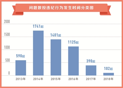 从66次“每周通报”曝光的问题发生时间看,“四风”增量问题得到有效遏制,但反弹回潮隐患犹存。据统计,5349起被曝光的问题中,发生在2013年590起,占比11%;2014年1741起,占比32.5%;2015年1401起,占比26.2%;2016年1125起,占比21%;2017年390起,占比7.3%;2018年102起,占比1.9%。
