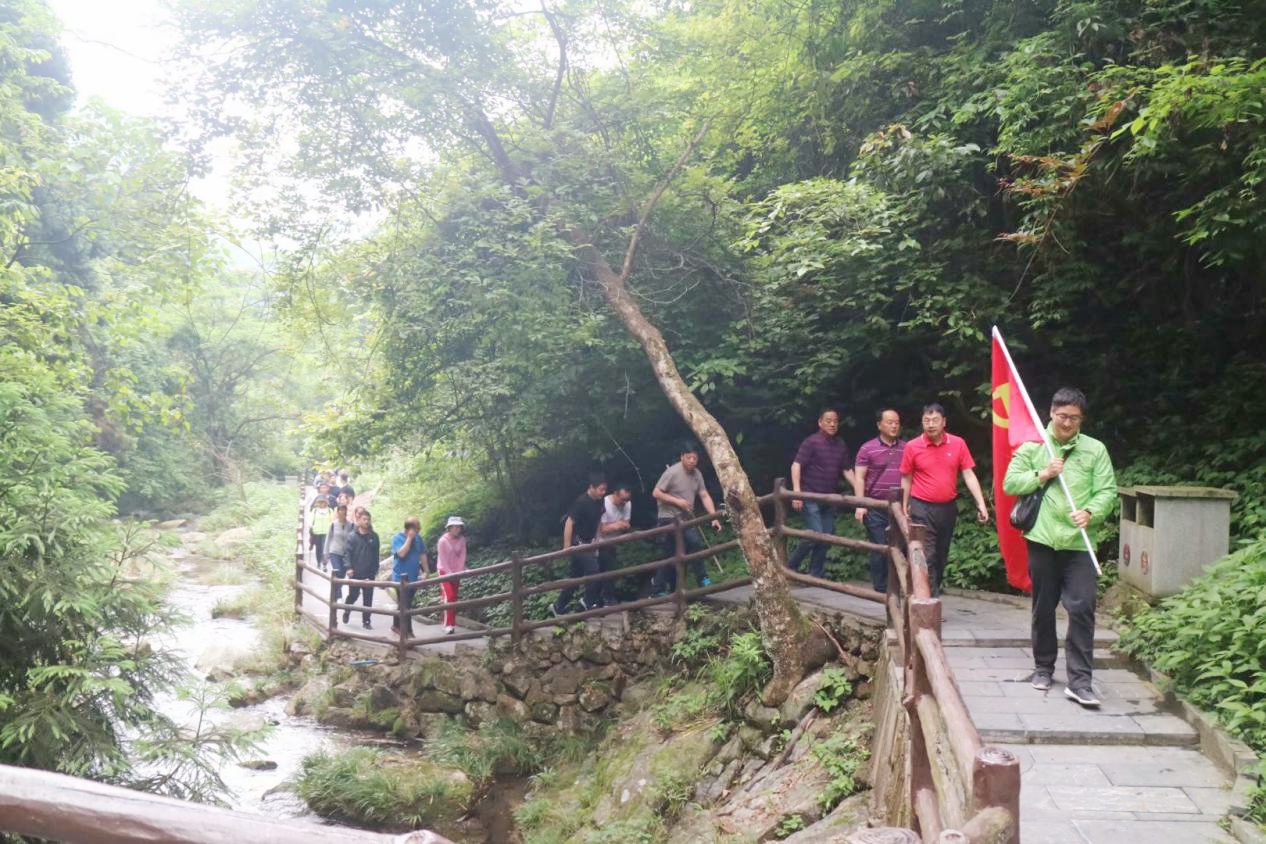 图为全体党员在党旗引领下重走长征路、再登老山界