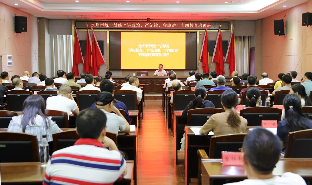 6月5日,永州市委统战部在市反腐倡廉教育基地管理中心开展“讲政治、严纪律、守廉洁”专题教育培训,市委常委、统战部长石艳萍主持并作总结讲话,市委常委、市纪委书记、市监委主任杨永作专题讲课,市领导袁火林、彭爱华参加。