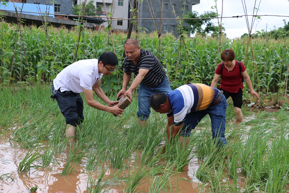 图为县纪委监委驻牛塘村工作队员和村干部一起帮助腿部残疾的贫困户何五文疏通水稻田里的洪水,垒砌护堤,扶正秧苗。