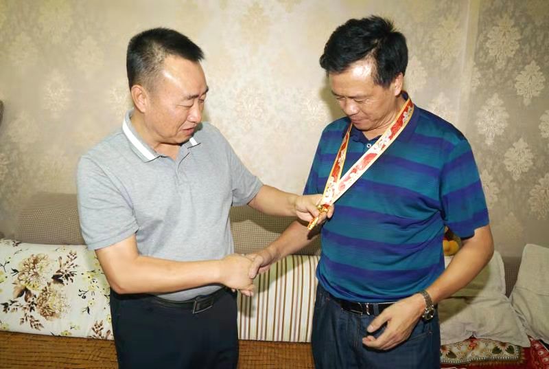 杨永(左)为王满元颁发“庆祝中华人民共和国成立70周年”纪念章