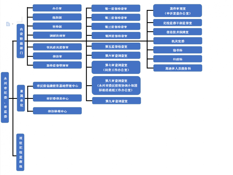 永州市纪委监委组织机构包括:内设职能部门、派驻纪检监察组和直属单位。内设职能部门具体为:办公室、组织部、宣传部、调研法规室、党风政风监督室、信访室、案件监督管理室、第一至第五监督检查室、第六至第九审查调查室、案件审理室、纪检监察干部监督室、信息技术保障室、秘书科、行政科、离退休人员管理服务科、机关党委。