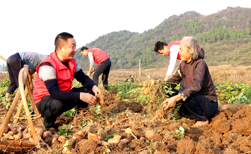 连日来,永州市宁远县纪委监委结合“不忘初心、牢记使命”主题教育,组织党员干部走进田间地头,深入农户家中,用群众喜闻乐见的方式宣传十九届四中全会精神,了解惠农政策落实情况、涉农补贴资金发放等情况。同时,用实际行动帮助群众解决生产生活中遇到的困难,提升群众的幸福感。图为:日前,在宁远县太平镇坪下村,纪检干部向村民宣讲十九届四中会议精神,并帮助缺劳力村民收红薯。(李萍 宁纪宣 摄影报道)