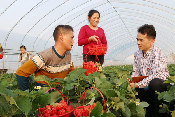 图为1月5日,在桐山街道宝塔脚村何氏大棚草莓家庭农场,该县纪检监察干部向种植户了解惠民政策落实和镇村干部作风等情况。(李萍 刘鹏 摄)