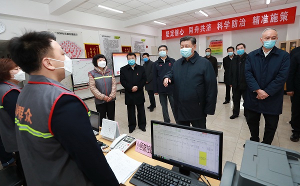 2月10日,中共中央总书记、国家主席、中央军委主席习近平在北京调研指导新冠肺炎疫情防控工作。这是习近平在朝阳区安贞街道安华里社区,了解基层一线疫情联防联控情况。(新华社记者 庞兴雷 摄)