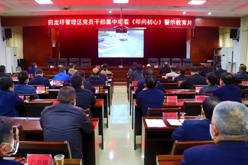 ▲回龙圩管理区组织党员干部集中观看《叩问初心》警示教育片