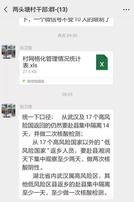 向卫煌在两头塘村微信群发送的最后一条工作信息
