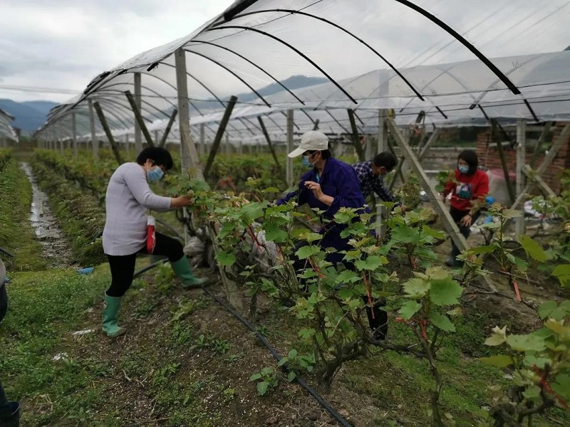 ▲在蓝山县塔峰镇花果园村的葡萄园里,住村干部和贫困户一起修剪枝苗。