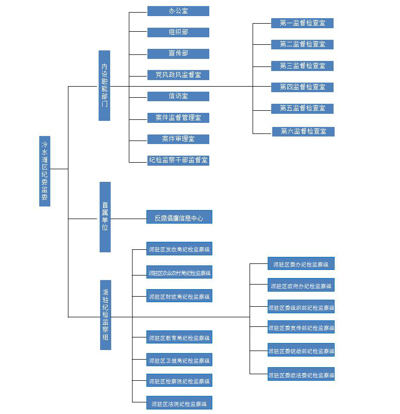 冷水滩区纪委监委组织机构包括:内设职能部门、直属单位和派驻纪检监察组。内设职能部门具体为:办公室、组织部、宣传部、党风政风监督室、信访室、案件监督管理室、案件审理室、纪检监察干部监督室、第一至第六监督检查室。