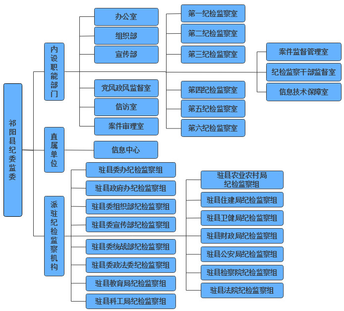 祁阳县纪委监委组织机构包括:内设职能部门、直属单位和派驻纪检监察组。内设职能部门具体为:办公室、组织部、宣传部、党风政风监督室、信访室、案件监督管理室、第一至第六纪检监察室、案件审理室、纪检监察干部监督室、信息技术保障室、机关党委。