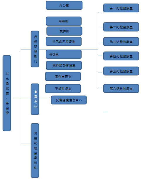江永县纪委监委组织机构包括:内设职能部门、直属单位和派驻纪检监察组。内设职能部门具体为:办公室(调研法规室)、组织部、宣传部、党风政风监督室、信访室(案件监督管理室)、案件审理室、纪检监察干部监督室、第一至第六纪检监察室。