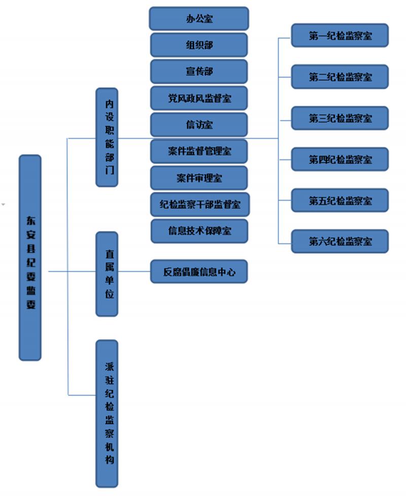 东安县纪委监委组织机构包括:内设职能部门、直属事业单位和派驻纪检监察组。内设职能部门具体为:办公室、组织部、宣传部、党风政风监督室、信访室、案件监督管理室、案件审理室、纪检监察干部监督室、第一至第六纪检监察室、信息技术保障室。