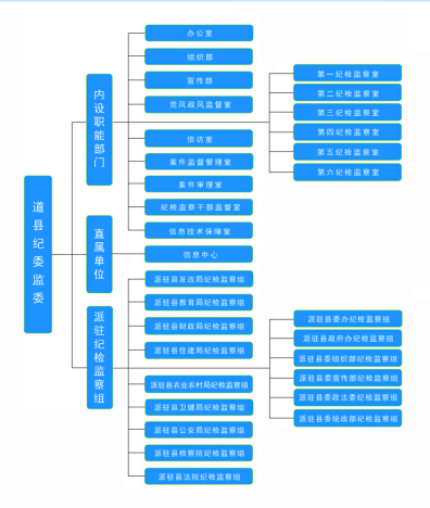 道县纪委监委组织机构包括:内设职能部门、直属单位和派驻纪检监察组。内设职能部门具体为:办公室、组织部、宣传部、党风政风监督室、信访室、案件监督管理室、案件审理室、纪检监察干部监督室、信息技术保障室、第一至第六纪检监察室。