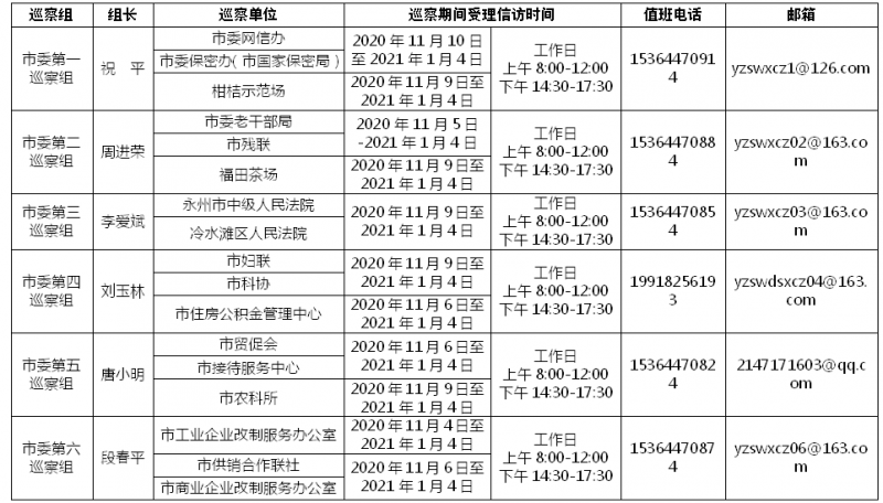 本次巡察时间为2个月,市委巡察组设专门值班电话和电子信箱,每天受理电话时间为工作日的上午8∶00至12∶00、下午14∶30至17∶30,受理信访时间截止到2021年1月4日。根据巡察工作有关规定,市委巡察组主要受理反映被巡察单位党委(党组)领导班子及其成员、市委管理的其他干部及下一级主要负责人、重要岗位领导干部等问题反映的来信、来电、来访。重点是关于违反政治纪律、组织纪律、廉洁纪律、群众纪律、工作纪律和生活纪律等方面的举报和反映。其他不属于巡察受理范围的信访问题,将按规定转交有关部门处理。