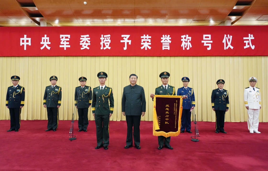 中央军委举行授予荣誉称号仪式习近平向获得荣誉称号的单位颁授奖旗