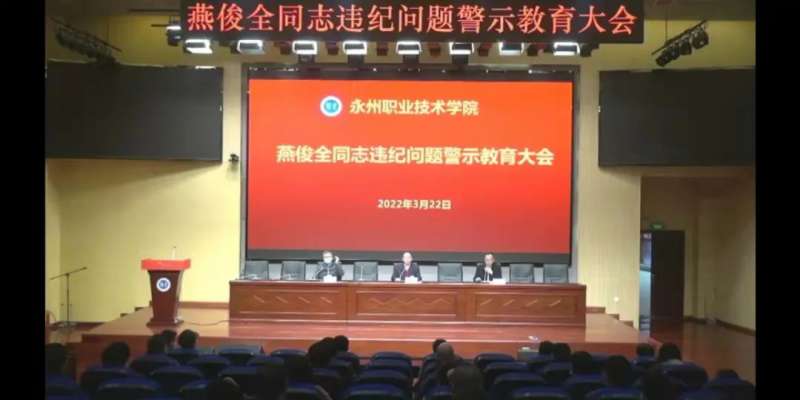 3月22日下午,永州职业技术学院采用线上线下同步进行的方式,召开燕俊全同志违纪问题警示教育大会。在家校领导、各处室和学院负责人、各党支部书记、机关党员代表等在主会场参加,其他师生以视频方式观看直播。会议由党委委员、组织部部长熊礼杭主持。据统计全校师生共22752人参加或观看会议直播。