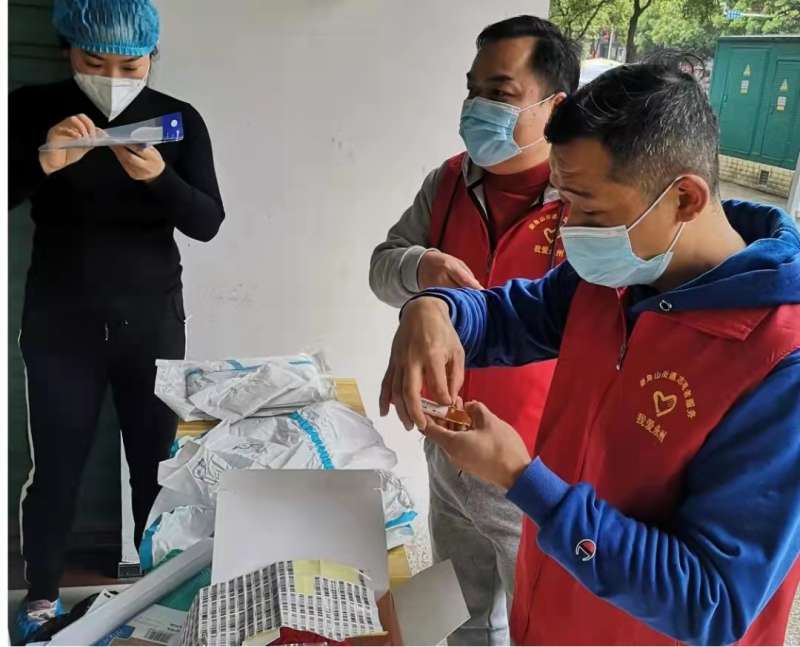 ▲图为进入封控区前,菱角山街道纪工委工作人员帮忙粘贴采样管条形码,准备防护用品。
