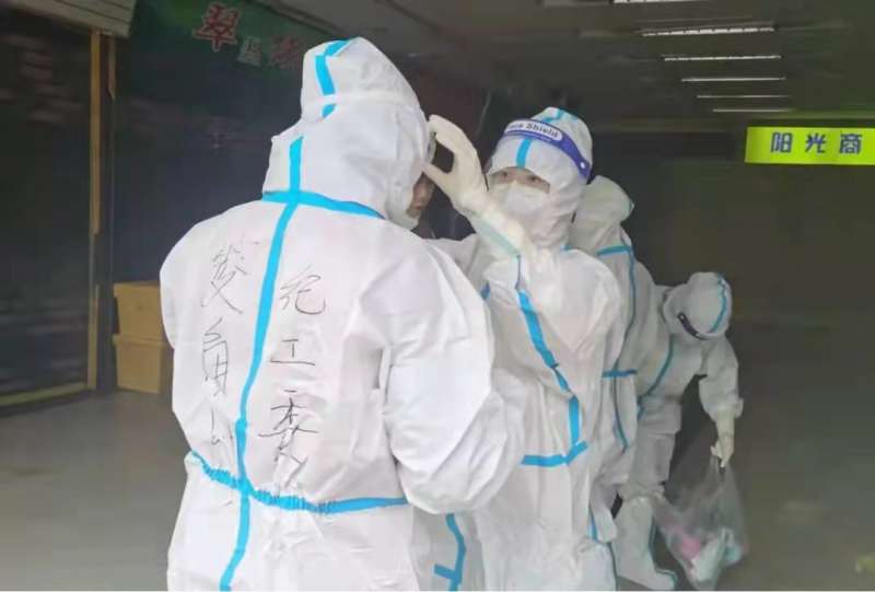 经过连日来的“实战”,我们对进入封控区的准备工作从手足无措已经变得游刃有余。正式进入封控区前,我们先帮医护人员粘贴采样管的条形码,准备好咽拭子、手套、面屏等用品,随后再穿戴防护服。为了防止手套和脚套滑落,我们和医护人员互相帮忙用透明胶带多次缠绕封口。作为并肩作战的“战友”,大家从第一次碰面,便十分亲密又默契。我想,如果不是突发疫情,也许我们此生都不会穿上这“大白”深入封控一线。