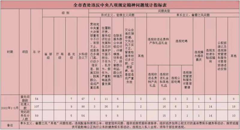 4月7日,永州纪委监委公布了2022年一季度全市查处违反中央八项规定精神问题汇总情况。2022年1-3月,全市各级纪检监察机关共查处违反中央八项规定精神问题54起,处理107人,给予党纪政务处分59人,同比去年同期分别增长14.89%、33.75%、9.26%。