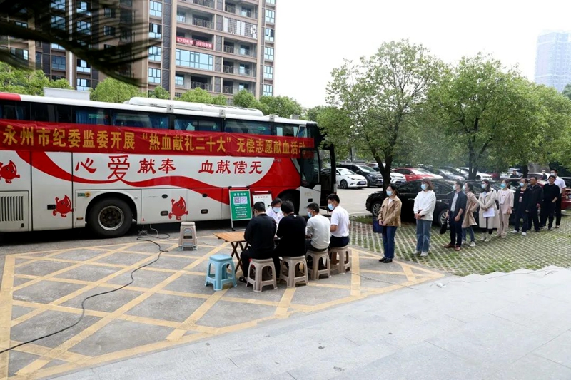 5月18日,永州市纪委监委开展“热血献礼二十大”无偿献血活动。来自委机关、派驻纪检监察组、巡察机构等32名志愿者参加献血活动。